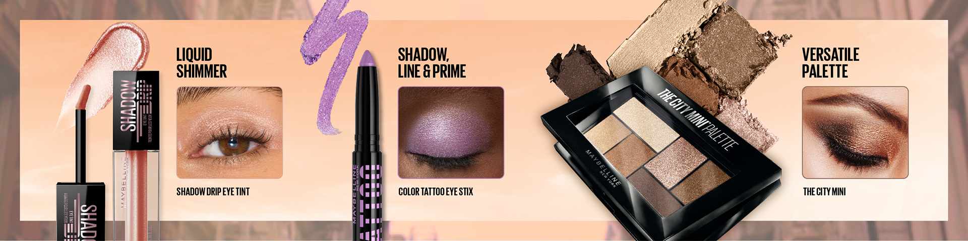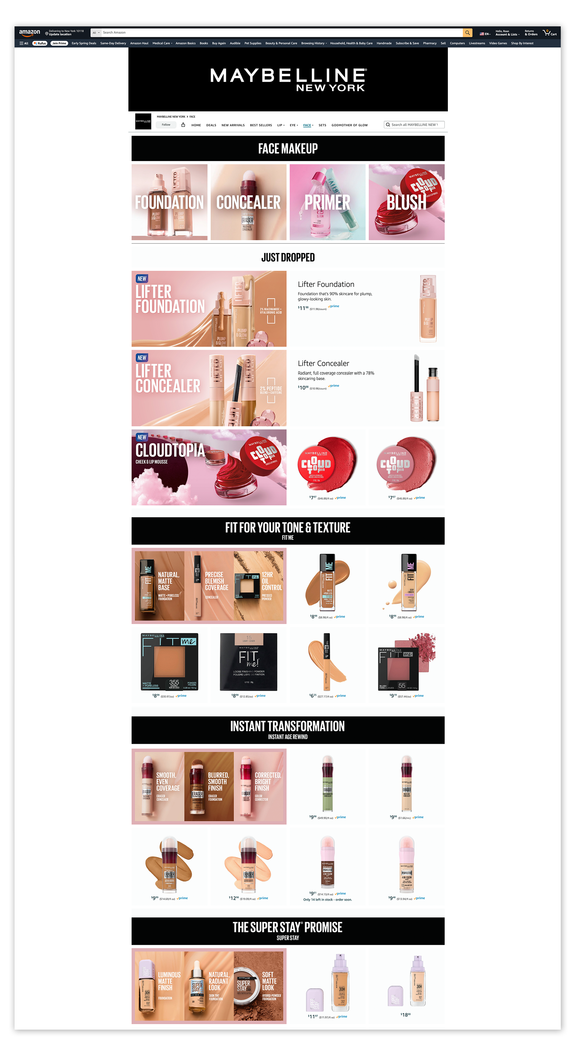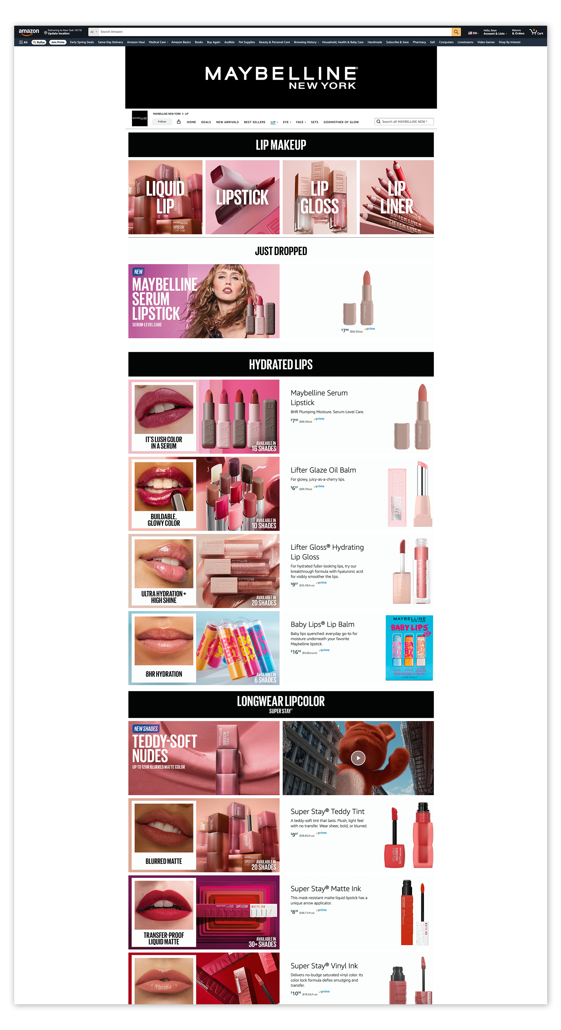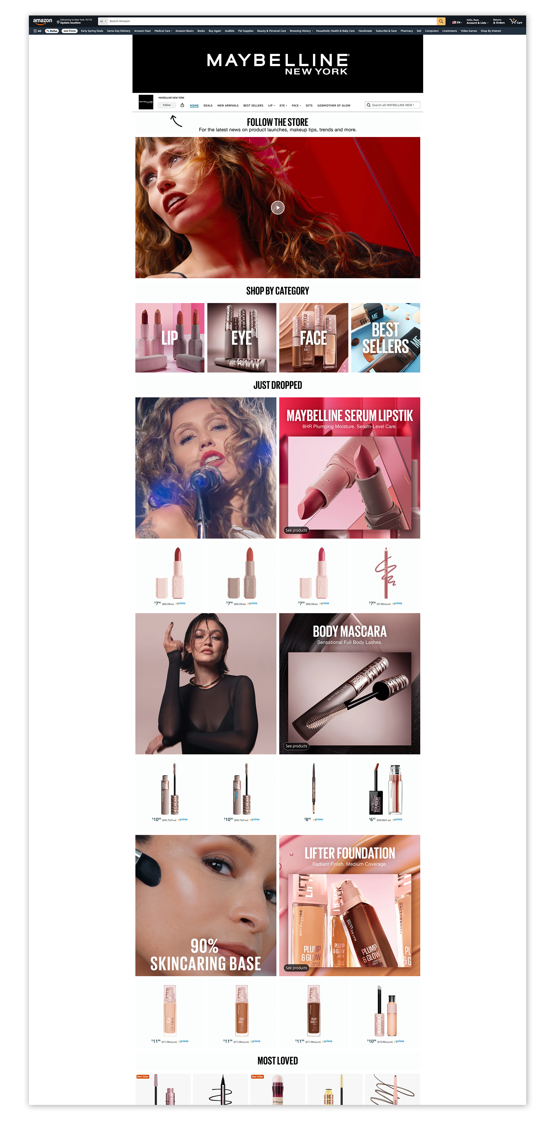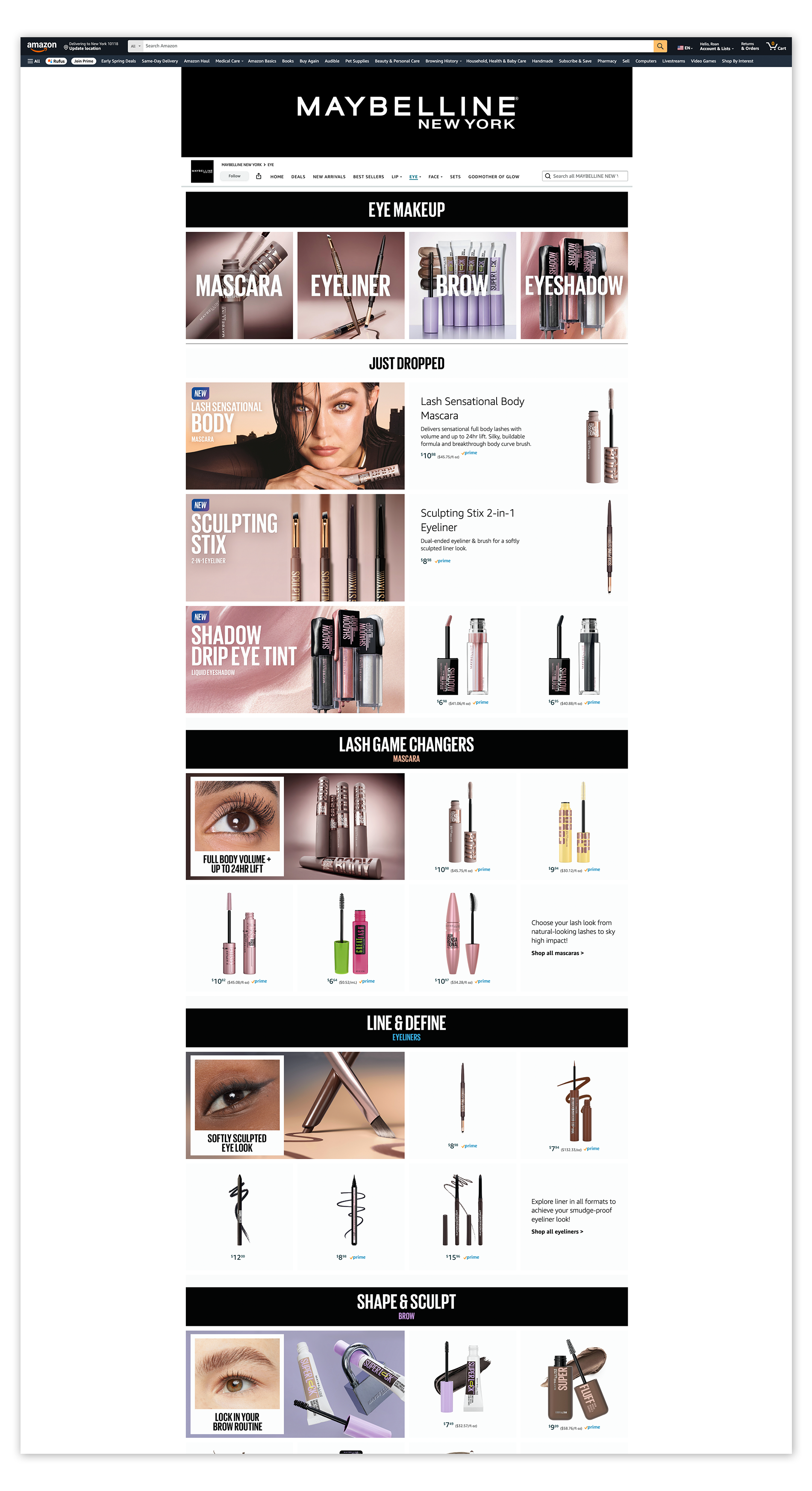 Self-initiated biannual seasonal updates to the Maybelline Amazon Brand Store, introducing just dropped products. Adapted for both desktop and mobile.